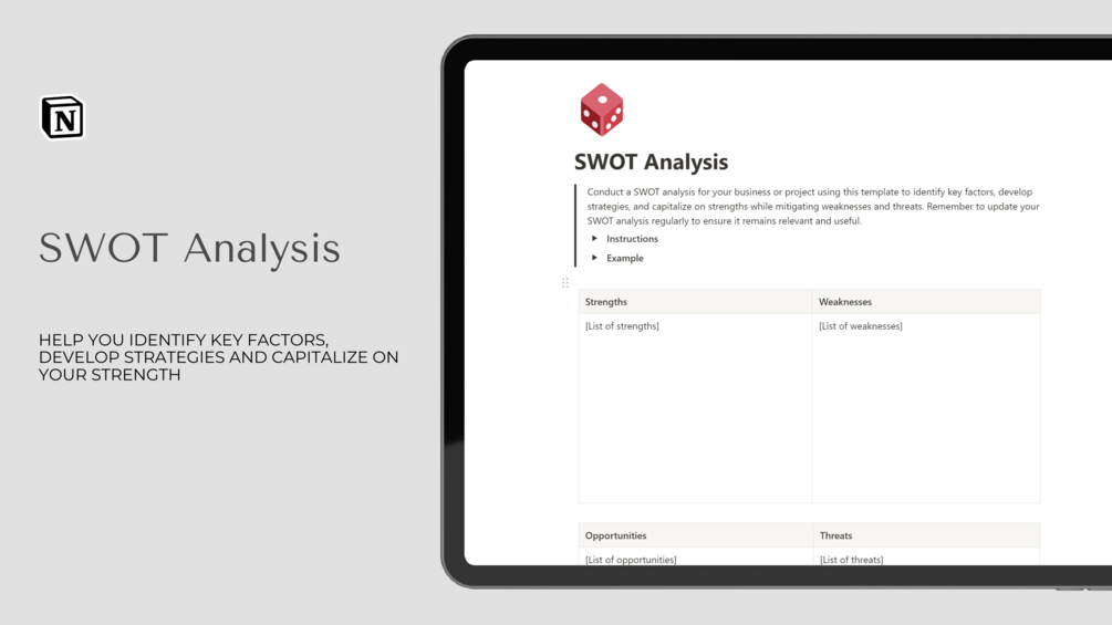 This Notion template is your key to a successful SWOT analysis. It's designed to be simple yet powerful, giving you all the tools you need to identify your business's strengths, weaknesses, opportunities, and threats.